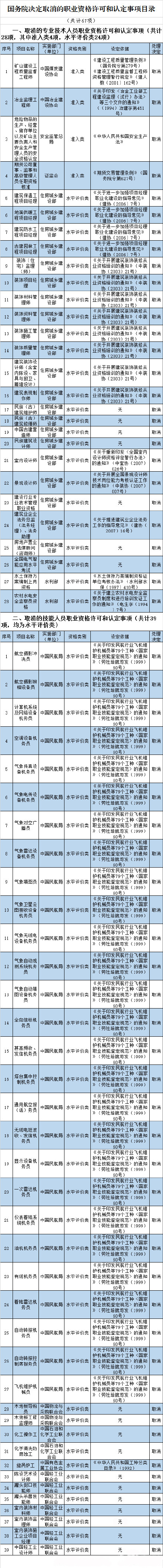 河南省教育網(wǎng)訊,近日國務(wù)院發(fā)布國發(fā)國發(fā)〔2015〕11號(hào)國務(wù)院關(guān)于取消和調(diào)整一批行政審批項(xiàng)目等事項(xiàng)的決定。文件說,經(jīng)研究論證,國務(wù)院決定,取消和下放90項(xiàng)行政審批項(xiàng)目,取消67項(xiàng)職業(yè)資格許可和認(rèn)定事項(xiàng),取消10項(xiàng)評(píng)比達(dá)標(biāo)表彰項(xiàng)目,將21項(xiàng)工商登記前置審批事項(xiàng)改為后置審批,保留34項(xiàng)工商登記前置審批事項(xiàng)。同時(shí),建議取消和下放18項(xiàng)依據(jù)有關(guān)法律設(shè)立的行政審批和職業(yè)資格許可認(rèn)定事項(xiàng),將5項(xiàng)依據(jù)有關(guān)法律設(shè)立的工商登記前置審批事項(xiàng)改為后置審批,國務(wù)院將依照法定程序提請(qǐng)全國人民代表大會(huì)常務(wù)委員會(huì)修訂相關(guān)法律規(guī)定。其中取消的職業(yè)資格許可和認(rèn)定事項(xiàng),包括礦山建設(shè)工程質(zhì)量監(jiān)督工程師、冶金監(jiān)理工程師、建筑裝飾設(shè)計(jì)師、室內(nèi)設(shè)計(jì)師、景觀設(shè)計(jì)師、氣象填圖員、化工操作工、中國輕工業(yè)設(shè)計(jì)師等。如下圖所示:圖片來自網(wǎng)絡(luò)。